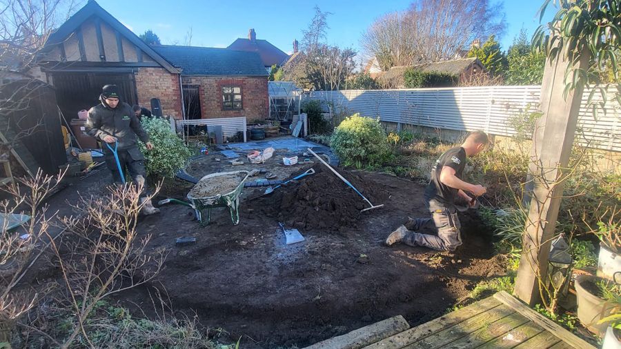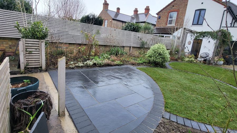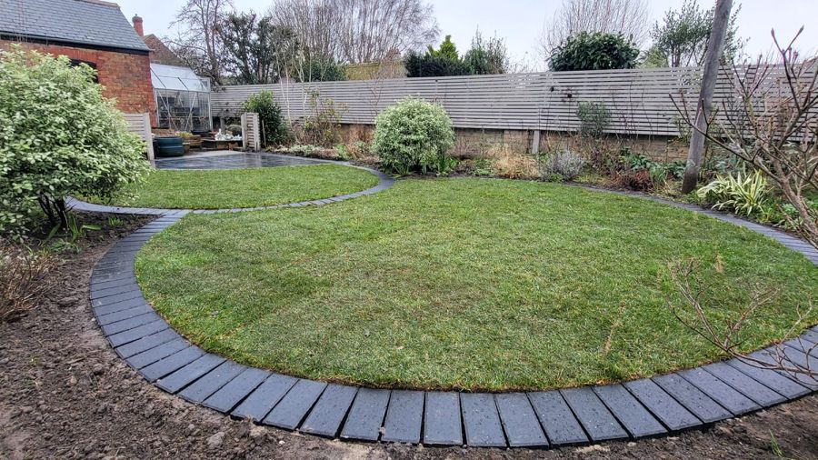 At the heart of this transformation was the quarter-circle patio, a design choice that brought both sophistication and functionality to the Barker’s garden. The patio was meticulously outlined in charcoal block edging, providing a sharp, contemporary contrast to the striking black limestone filling. This choice of materials not only ensured durability but also added a visually striking element to the garden, reflecting the homeowners’ unique style and the modern design ethos of Lincs Landscaping.