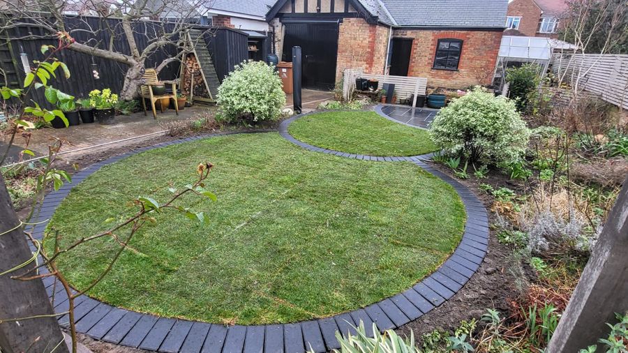 Further enhancing the garden’s allure, two additional interlocking circles were incorporated, echoing the initial geometric theme. These circles maintained the sleek charcoal edging but introduced a different infill – lush, vibrant turf. This infill choice created a stunning visual contrast, juxtaposing the solidity of the limestone with the softness and greenery of the turf, and added a fresh, organic feel to the structured design.